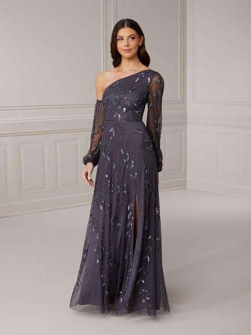 Elegance with options allows for a bit of customization as this A-line one-shoulder gown comes with one fully detachable sleeve. The stunning allover floral pattern features a sexy slit detail.
