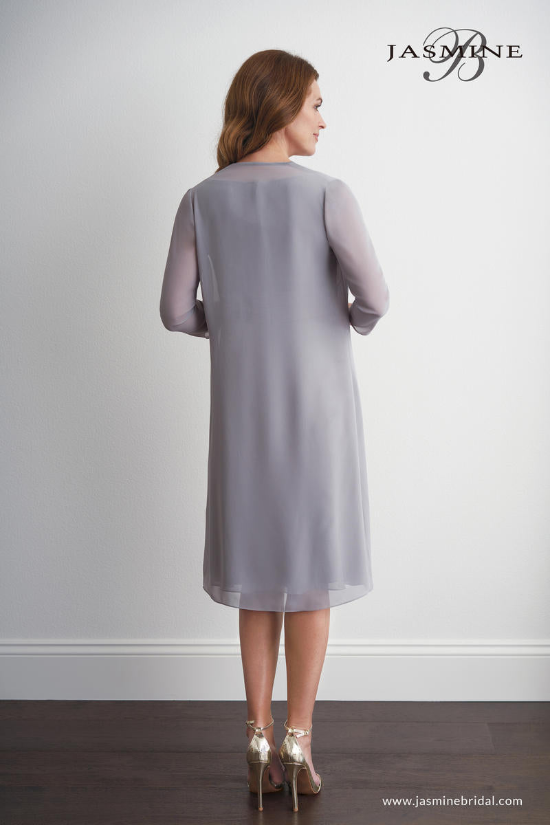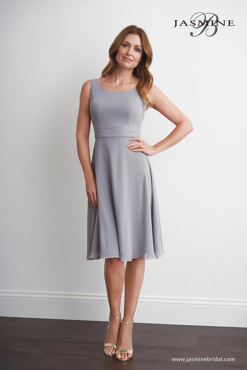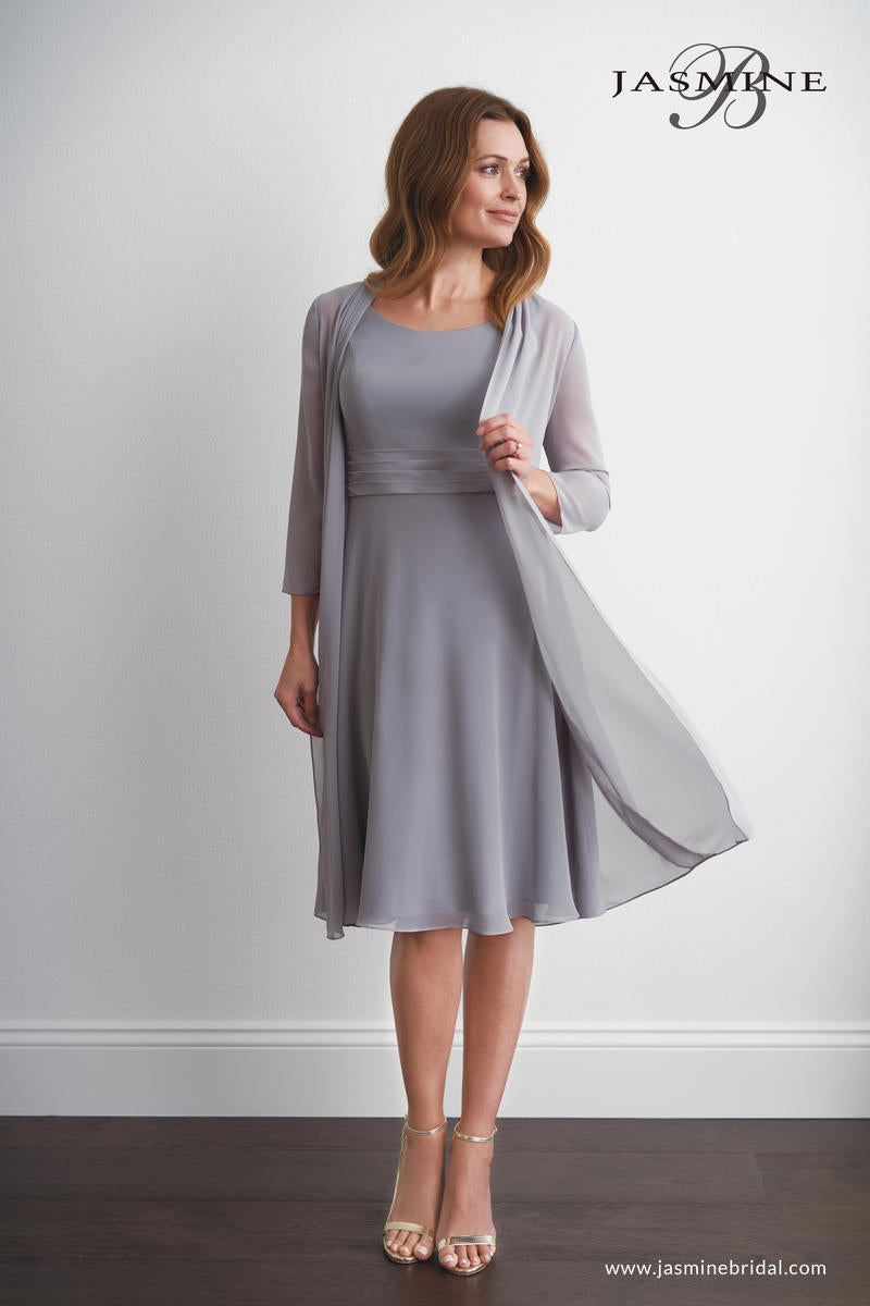 Pretty jade chiffon (with stretch lining) sleeveless knee length Mother of the Bride dress with a scoop neckline, detailed gathers on the bodice, and a flowy A-line skirt. This Mother of the Bride dress comes with a matching long sleeve long jacket.