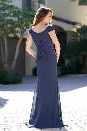 Pretty jade chiffon (with stretch lining) Mother of the Bride dress with a pretty portrait neckline. Detailed gathers on the bodice and A-line skirt to complete the look.